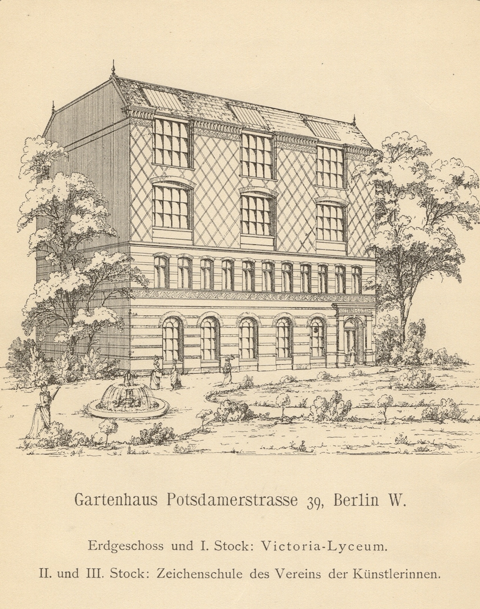 Lias Blick in den Hof des Kunstpalais (Bild 1). Die hier heute stehenden Häuser an der Potsdamer Straße (heute Nr. 98a, damals Nr. 39) wurden um 1890 gebaut, im Gebäude hinten links in der 2. und 3. Etage (oberhalb der heutigen Camaro-Stiftung, damals das Victoria-Lyceum für Höhere Frauenbildung – Bild 2) befanden sich ab 1893 die Ateliers der Zeichenschule des Vereins Berliner Künstlerinnen und Kunstfreundinnen (VdBK), wie er damals hieß – es gibt ihn immer noch als Verein der Berliner Künstlerinnen (VdBK) (https://www.vdbk1867.de). Der Verein war 1867 gegründet worden und hatte mehrere Interims-Domizile, bevor er hier eine vorläufige Heimat fand (ab 1911: Schöneberger Ufer 38 – heute 71). Dass es eine eigene Malschule nur für Mädchen und Frauen gab, hatte seine Bewandtnis darin, dass Frauen an der Berliner Akademie der Künste nicht zum Studium zugelassen waren. Sie waren daher darauf angewiesen, privaten Malunterricht zu nehmen, hier oder auch bei Professoren der Akademie, die deren Politik falsch fanden, so z.B. Karl Gussow (1843-1904), der seine Schule in der Buchenstraße (einer früheren Seitenstraße der Derfflinger Straße) hatte. Das Privatstudium war nicht nur teurer (es kostete bis zu 800 Mark/Jahr im Vergleich zu 180 Mark/Jahr an der Akademie), es diskriminierte auch die Kunst der Frauen als „diletantisch“ für viele Jahre. Die fadenscheinigen Gründe, mit denen die Berliner Akademie das Frauenstudium verhinderte, waren z.T. „moralischer“ Art: Zum Studium gehörte auch das Aktzeichnen, und das galt als verwerflich und zu verhindern – für Frauen! Aber vor allem war es wohl die Konkurrenz um die nur 180 Studienplätze für Männer an der Akademie, denen 800 „Malweiber“ gegenüberstanden. Hauptgegner der Zulassung der Frauen zum Kunststudium war übrigens der Direktor der Hochschule für die bildenden Künste, Prof. Anton von Werner (1843-1915), der gleich gegenüber in der Potsdamer Straße 113 (heute 81A, Mercator-Höfe) wohnte.
