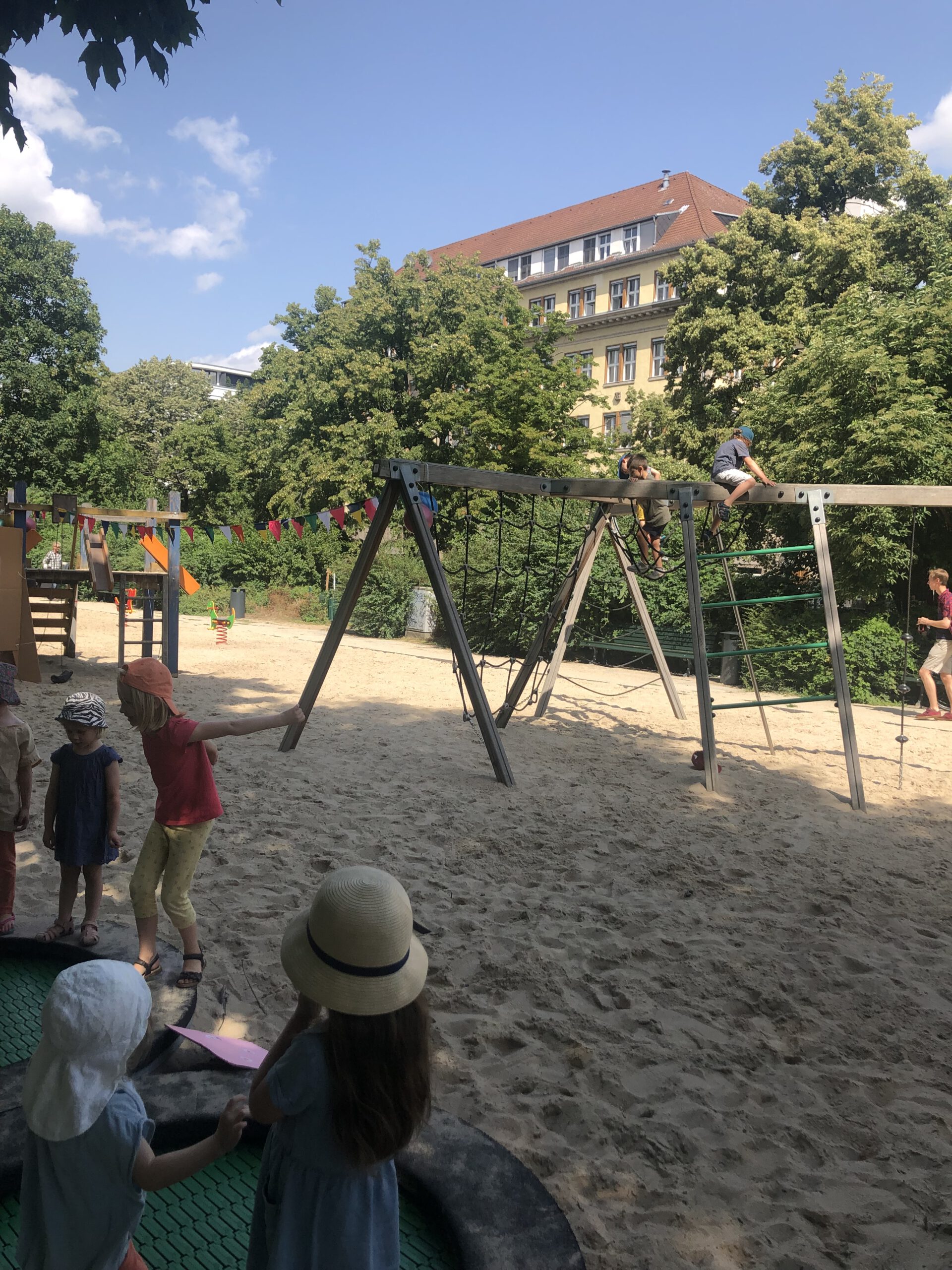 Am Dienstagvormittag war es endlich soweit: nach langjährigen Sanierungsmaßnahmen konnten die Kinder aus drei benachbarten Kitas und aus der Nachbarschaft den Spielplatz auf dem Magdeburger Platz wieder in Besitz nehmen. An der Planung für die Runderneuerung des Spielplatzes konnten sich Kinder beteiligen und Vorschläge machen. Nach ihren Wünschen kamen zwei Trampoline, eine Kleinkinder-Rutsche und eine Nestschaukel sowie eine Rennstrecke neu hinzu. Notwendige Instandsetzungen wurden vorgenommen und neue Sitzgelegenheiten gebaut.