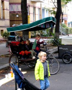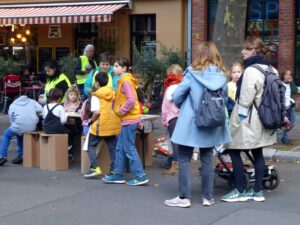 Die letzte Spielstraßenaktion in diesem Jahr am 22. September war gut besucht. Weil in ganz Berlin „Autofreier Tag“ war, gab es mehr Fördermittel als sonst, und die wurden sinnvoll eingesetzt. So konnte das Projekt „Wendepunkt“ der Jugendverkehrsschule Schöneberg/Tempelhof mehrere Go-Carts in verschiedenen Größen anbieten, die allesamt begeistert gefahren wurden. „Mobil im Kiez“ bot Materialien zum Malen und Bemalen von Taschen an, der Stand war ständig umlagert. Rikschas und Lastenräder waren ausgestellt.