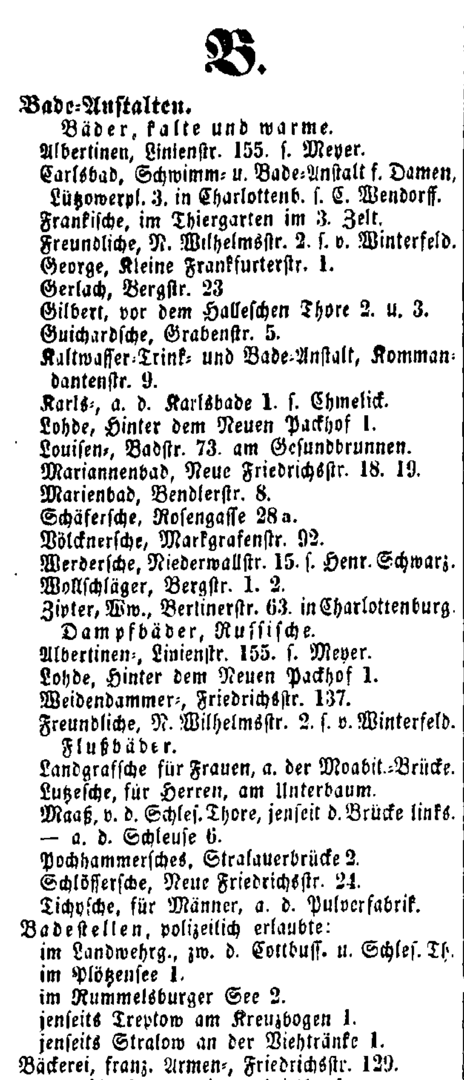 Auszug aus dem Berliner Adressbuch von 1850: Badehäuser und Badeanstalten (Quelle: https://digital.zlb.de/viewer/image/34111722_1850/851/)