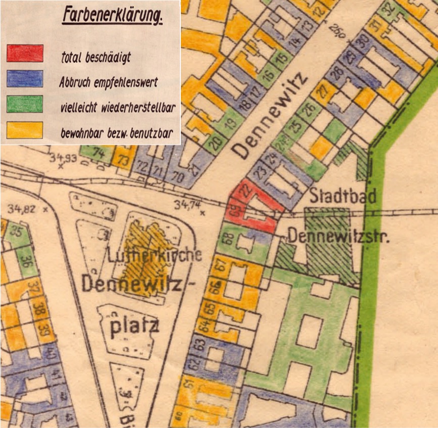 Ausschnitt aus der Schadenskarte des Bezirksamt Schöneberg-Tempelhof von 1945 (Quelle: https://www.berlin.de/ba-tempelhof-schoeneberg/politik-und-verwaltung/aemter/stadtentwicklungsamt/vermessung/schadenskarten-330642.php, Karte