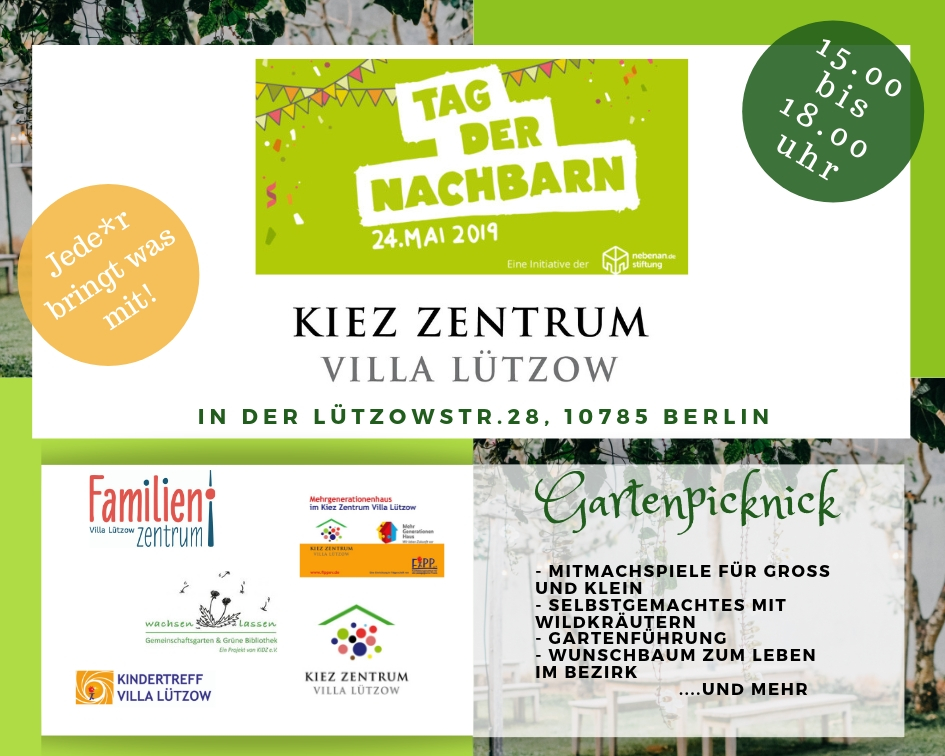 Am 24.Mai findet von 15:00 bis 18:00 Uhr im Kiez Zentrum Villa Lützow in der Lützowstraße 28, 10785 Berlin der „Tag der Nachbarn“ statt. Alle Kiezbewohner*innen sind herzlich willkommen!