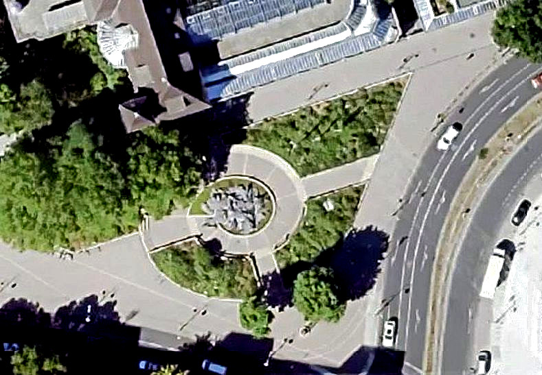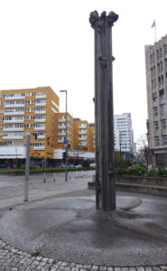 Ein Stück weiter auf dem Olaf-Palme-Platz bin ich am Ammoniten-Brunnen angekommen. Gemeint ist die Form des Brunnens – die eines Fossils.