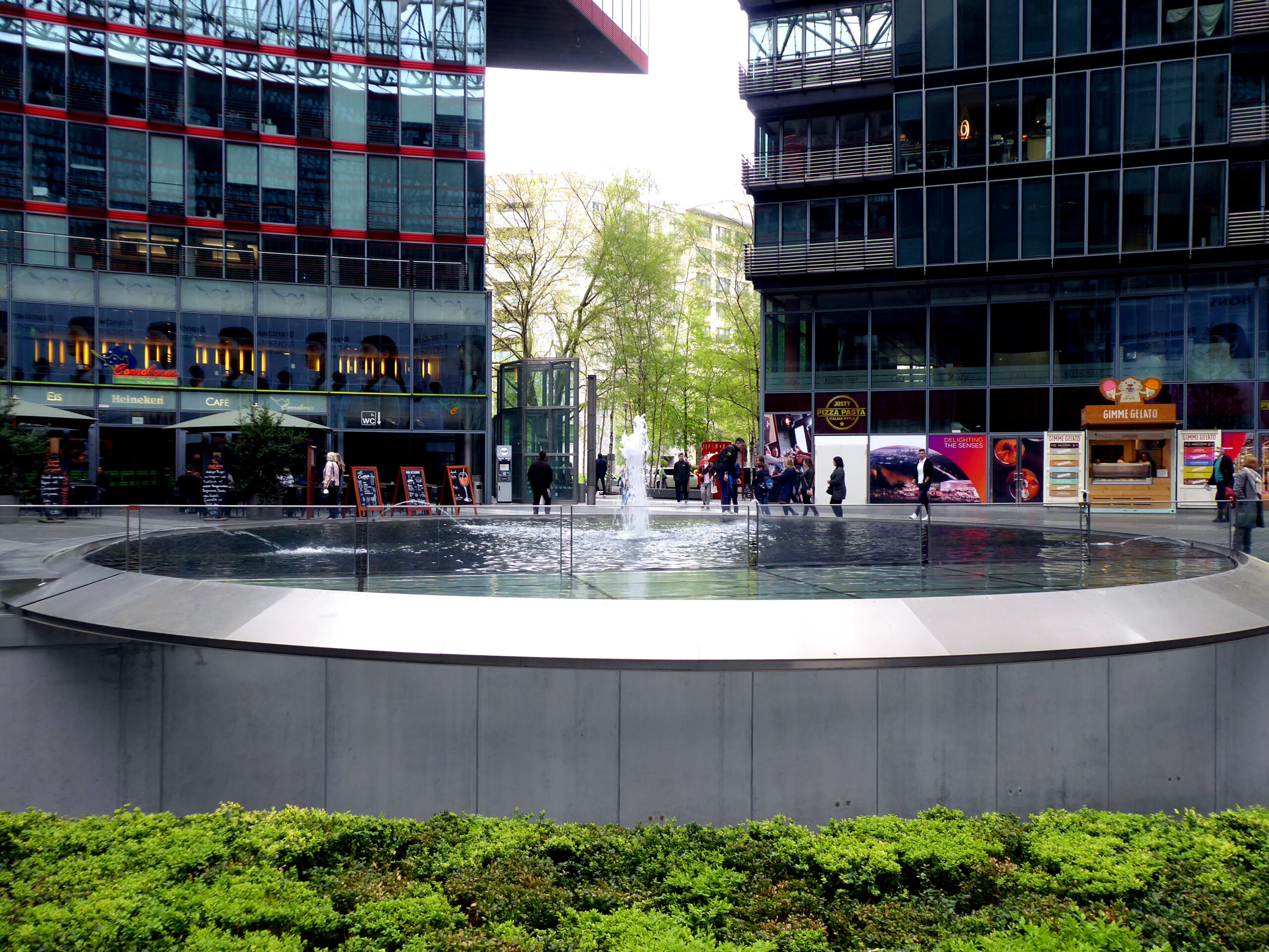 Ein Stück weiter unter dem Dach des Sony Centers, dass sich wie ein Schirm über den Innenhof spannt, schwebt ein ca. 15 m großer, kreisrunder Brunnen über dem Kellergeschoss. Aus seiner Mitte steigen kleine und große Fontänen, beleuchtet in unterschiedlichen Farben, abwechselnd gen Himmel. Der von Helmut Jahn im Jahr 2000 gestaltete Brunnen kann auch als Werbefläche genutzt werden. Das Sony-Center wird derzeit umgebaut. Bis 2023 soll der Brunnen leider Geschichte sein.