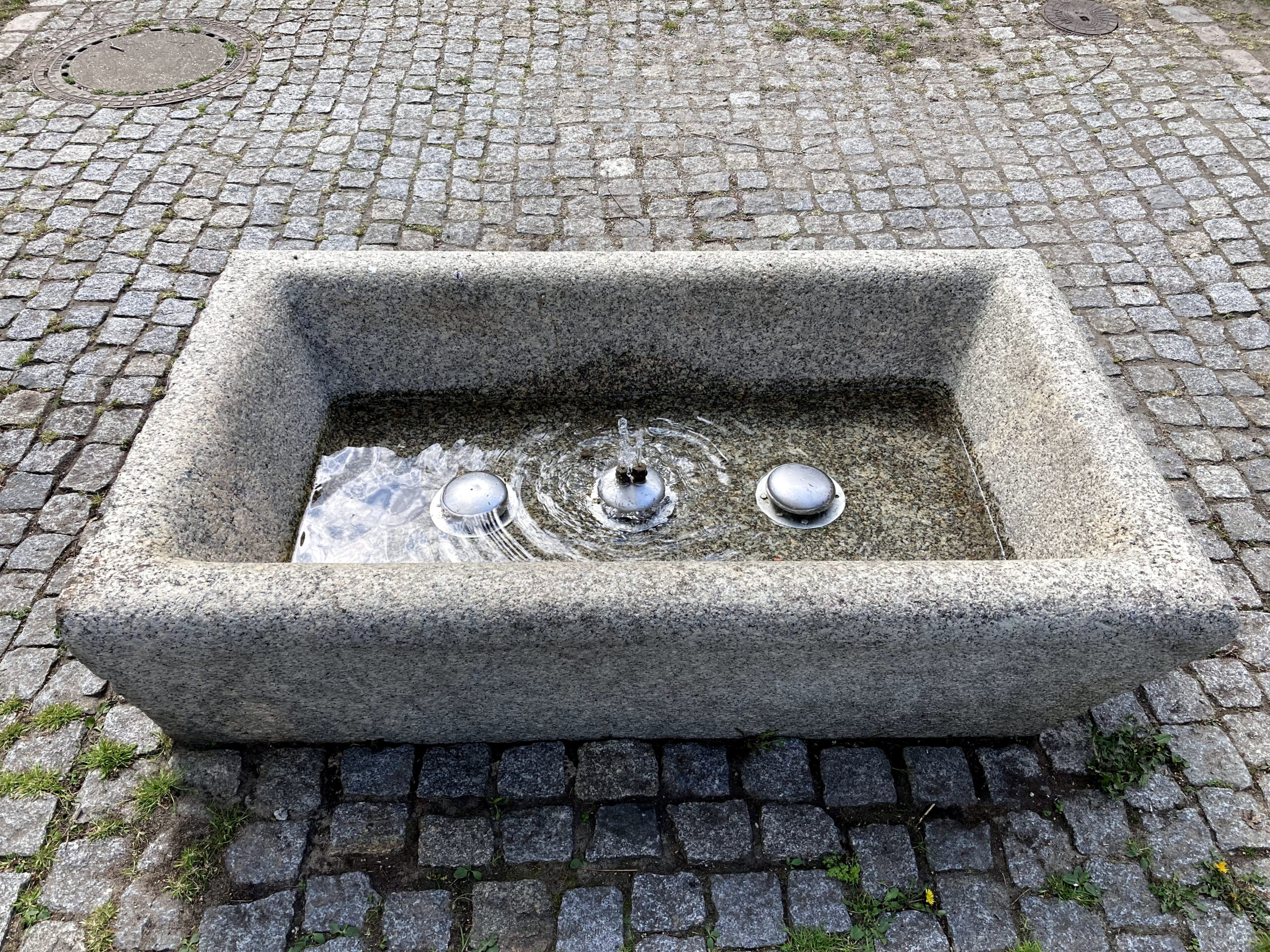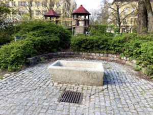 Hier erfrischen sich nicht nur Jogger*innen. Die Schale hat einen Durchmesser von 1,30 m. Der öffentliche Springbrunnen ist seit 1979 in Betrieb. Das Bezirksgrünflächenamt sowie private Spenden sorgen für den Erhalt der kleinen Brunnenanlage.