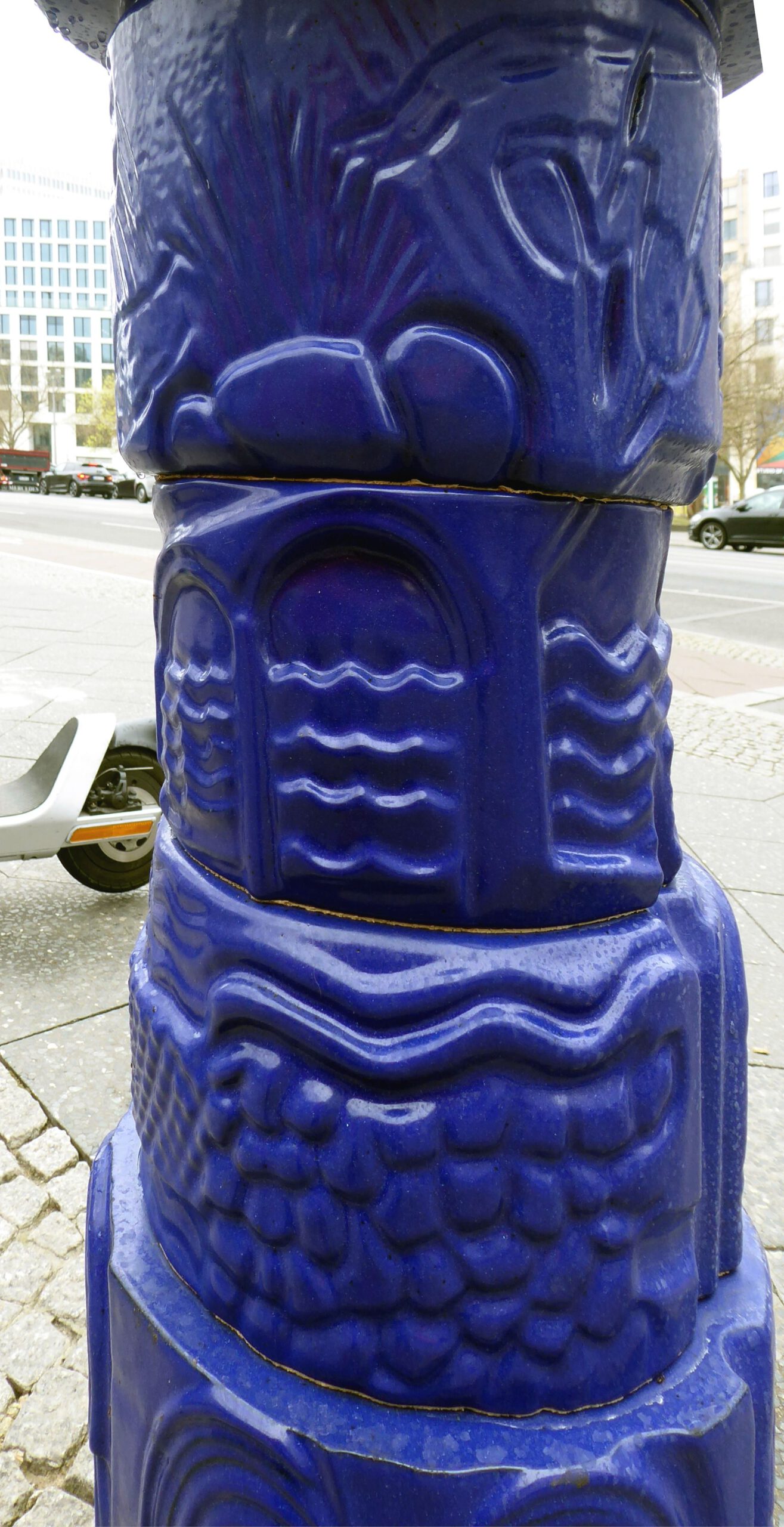 Im unteren Teil der Säule sind fünf übereinander angeordnete Reliefs zu Themen der Berliner Stadtgeschichte angeordnet. Die Entwürfe stammen vom Designer Siegfried Kaiser.