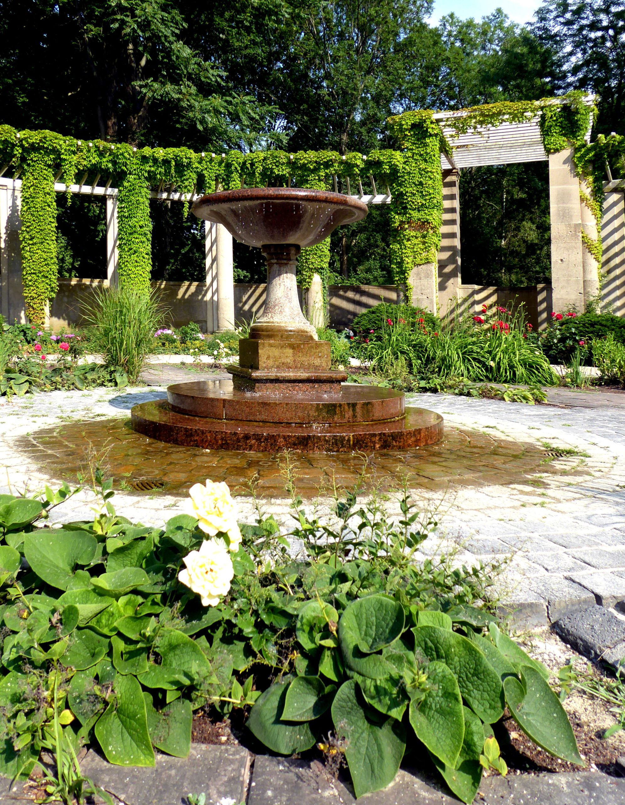 Ganz in der Nähe, im Rosengarten des Großen Tiergartens, setze ich mich auf eine der Bänke gegenüber der runden Brunnenschale mit Säule, beides aus rotem Marmor, die auf einem quadratischen Sockel steht. Ich nehme mir Zeit für eine kurze Pause. Eine kleine Düse inmitten der Schale spendet das Wasser für den Brunnen.