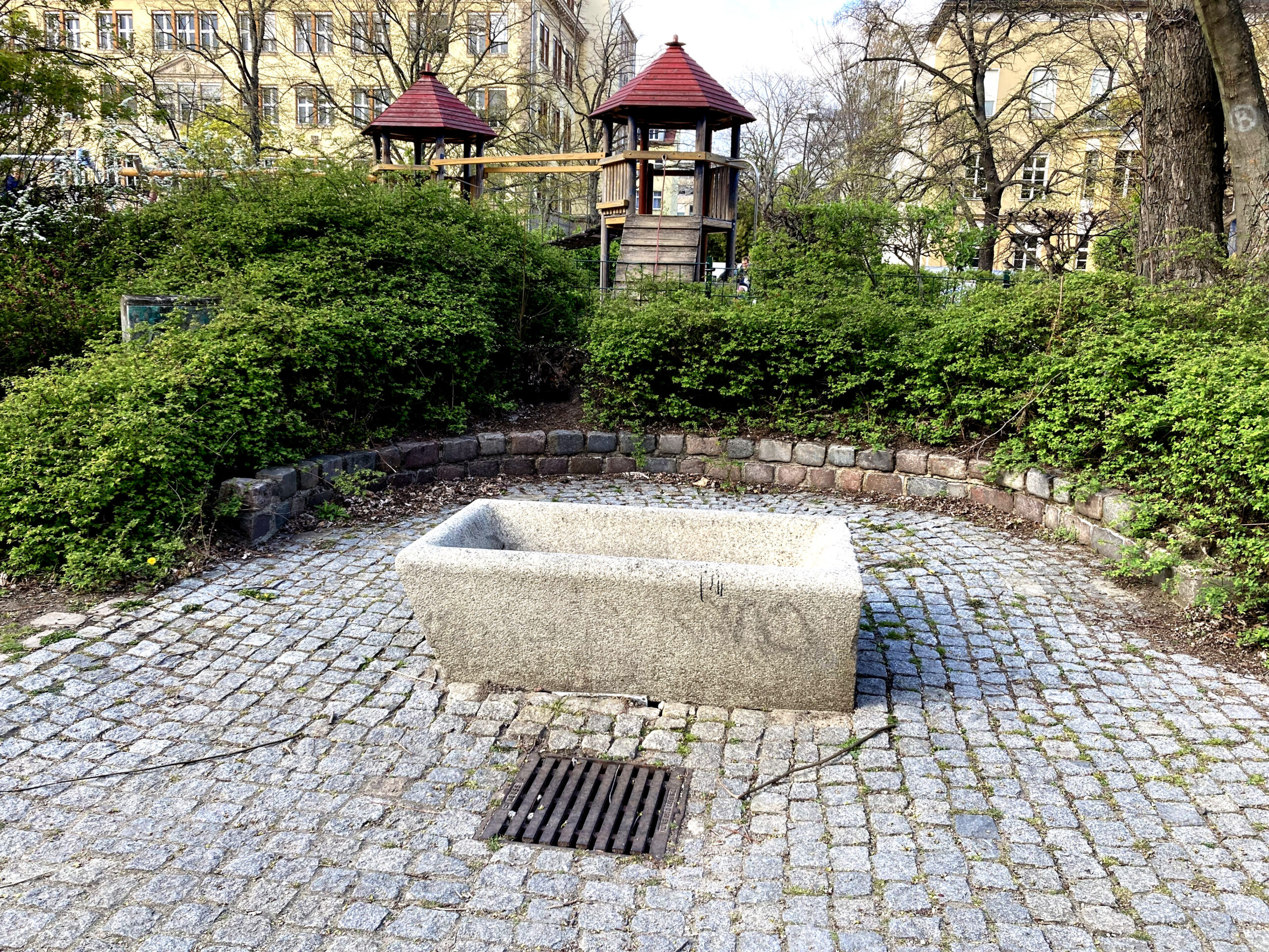 Das rechteckiges Granitbecken von 1,50 x 0,90 x 0,50 m ist eine historische Pferdetränke. Im 19. Jahrhundert waren sie häufig auf Berlins Straßen zu sehen. Das Becken auf dem 100 m langen und 30 m breiten Magdeburger Platz, der den Namen der damaligen preußischen Provinz- und heutigen Landeshauptstadt Magdeburg (Sachsen-Anhalt) führt, stammt aus dem Jahr 1872. In den 1980er Jahren wurde der steinerne Trog hier vor dem Spielplatz aufgestellt. Eine kleine Wasserfontäne füllt das Becken nicht ganz mit Wasser. Die Kinder vom neu angelegten Spielplatz freut es dennoch. Ein Vertrag zwischen dem Bezirksamt Mitte von Berlin und der Ströer Marketing GmbH regelt die Sauber- und Instandhaltung des Brunnenbetriebs.