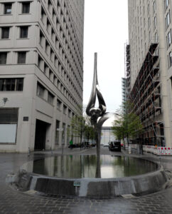 Am Inge-Beisheim-Platz in der August-Hauschner-Straße am Potsdamer Platz fällt mir gleich „Phönix“, die Skulptur des israelischen Künstlers Gidon Graetz auf. Die 5 m hohe, metallisch glänzende Skulptur aus Edelstahl, ein Geschenk der Otto-Beisheim-Stiftung an Berlin, steht in einem 2004 errichteten ovalen Überlaufbecken mit spiegelnder Wasseroberfläche. Sie symbolisiert wie „Phoenix aus der Asche“ den neuen Potsdamer Platz.