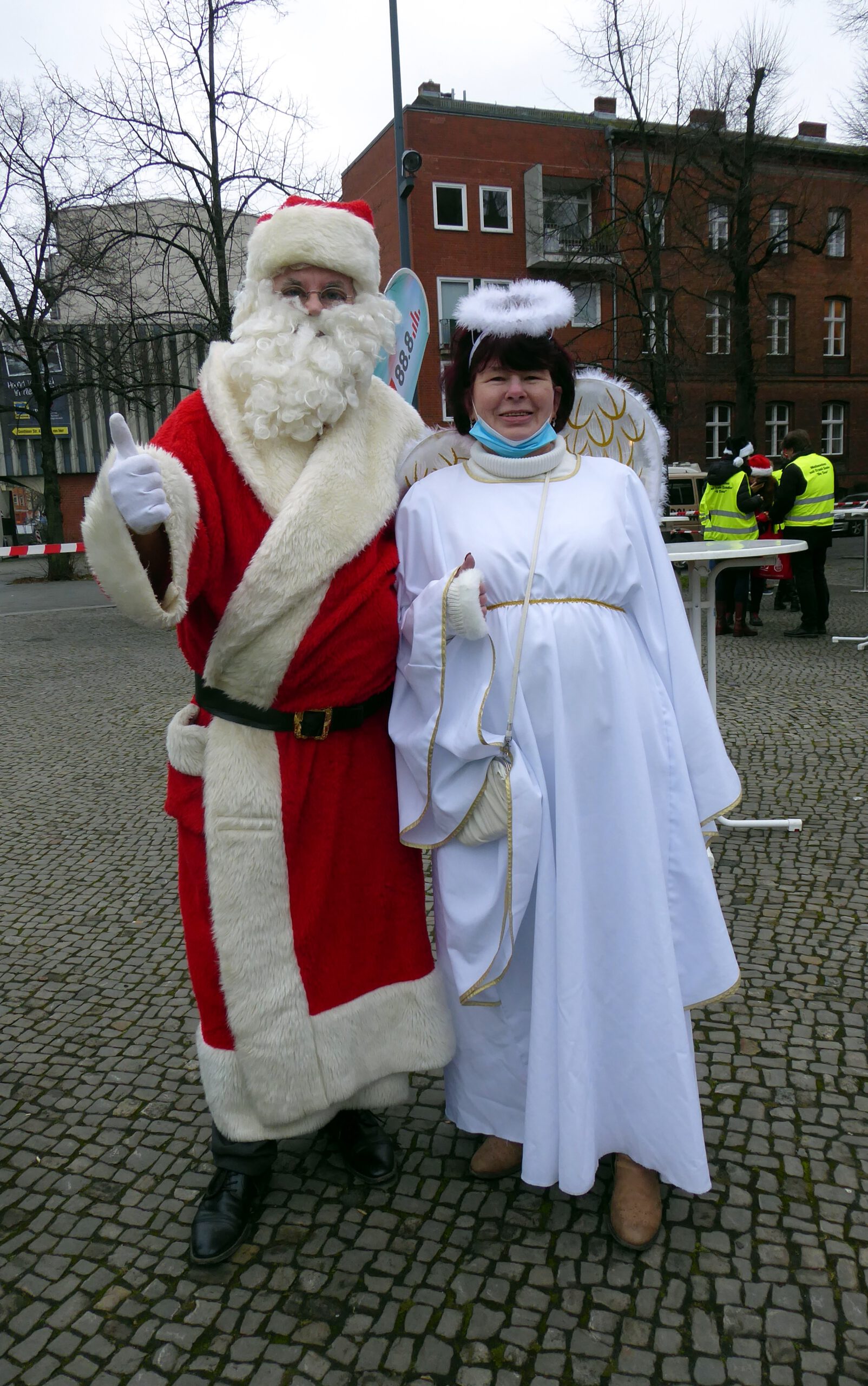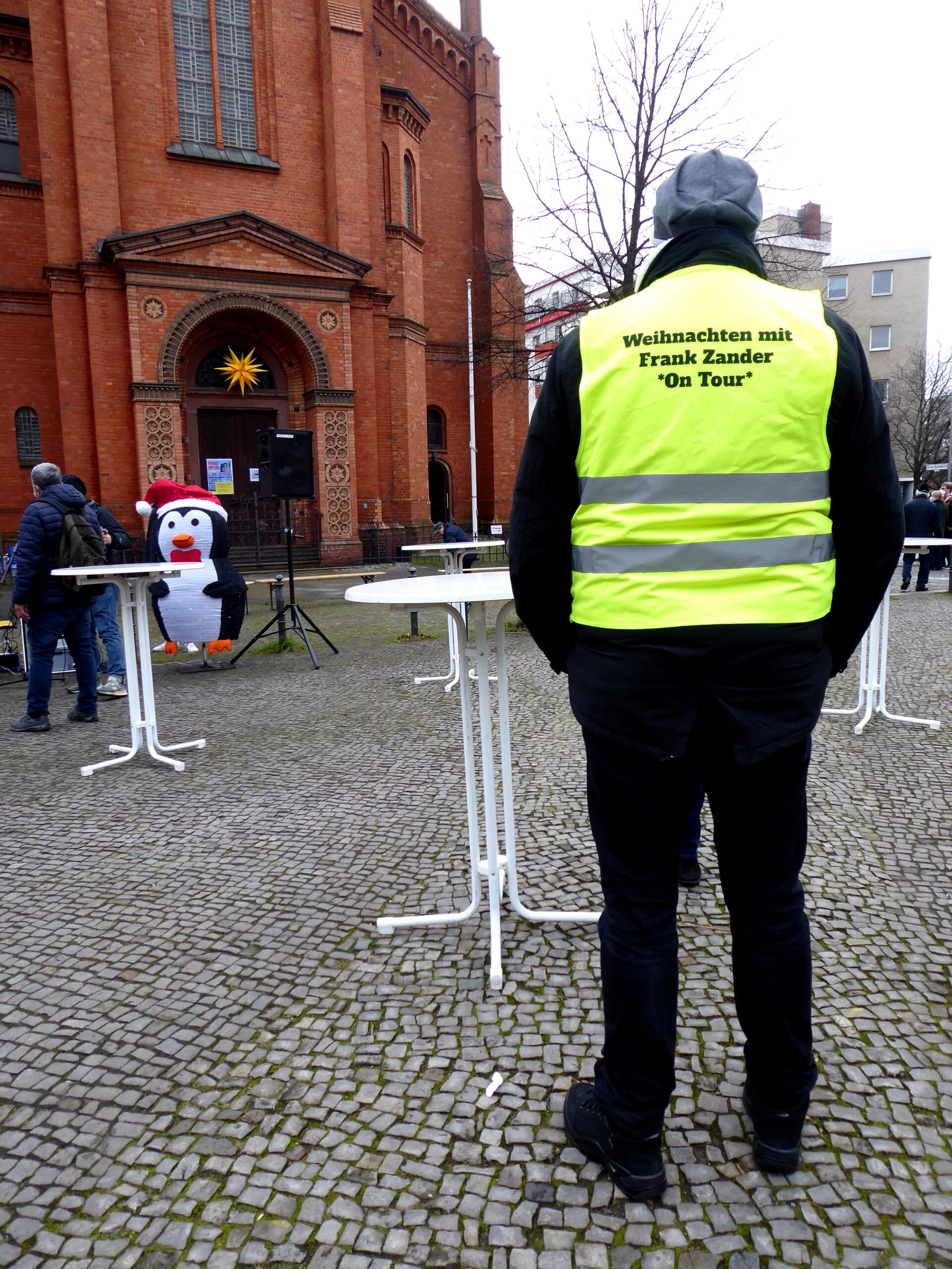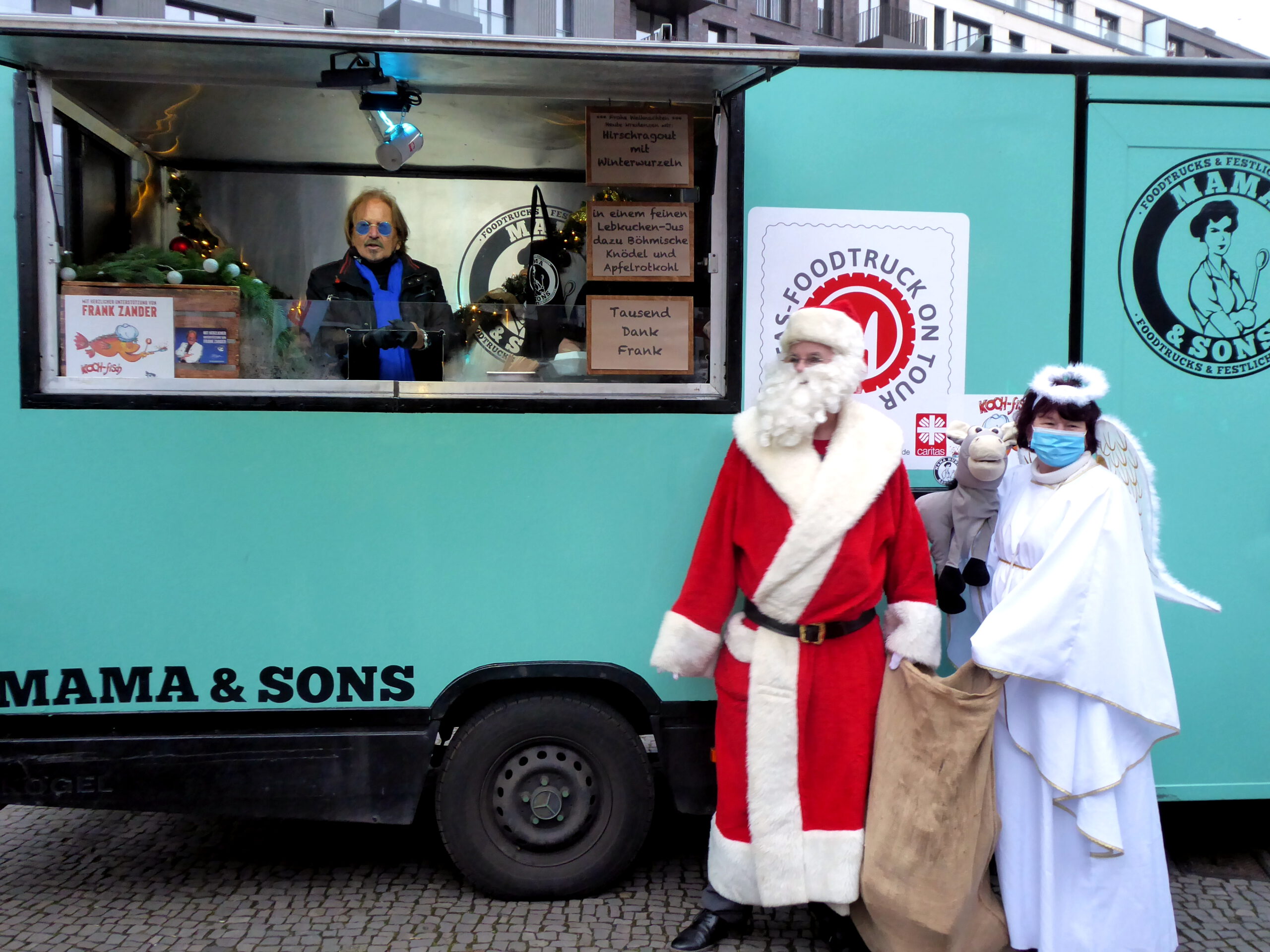 Heute waren Frank Zander, sein Sohn Marcus und sein Team nicht nur mit dem Caritas-Foodtruck vor der Ev. Zwölf-Apostel-Kirche, sie alle wurden zusätzlich von der GdP (Gewerkschaft der Polizei/Bundespolizei) und dem Weihnachtsmann Bernd König („DJ Fridolin“) und seinem Engel (seine Frau „DJ Fridoline“) der mobilen Discothek „Fridolin’s Disco“ unterstützt.