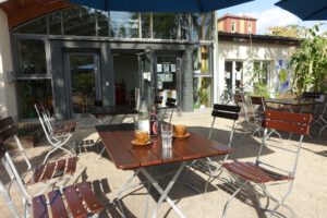 Sie können sich bei Kaffee, Tee und kühlen Getränken sowie einem kleinen Imbiss oder einem Stück Kuchen stärken.