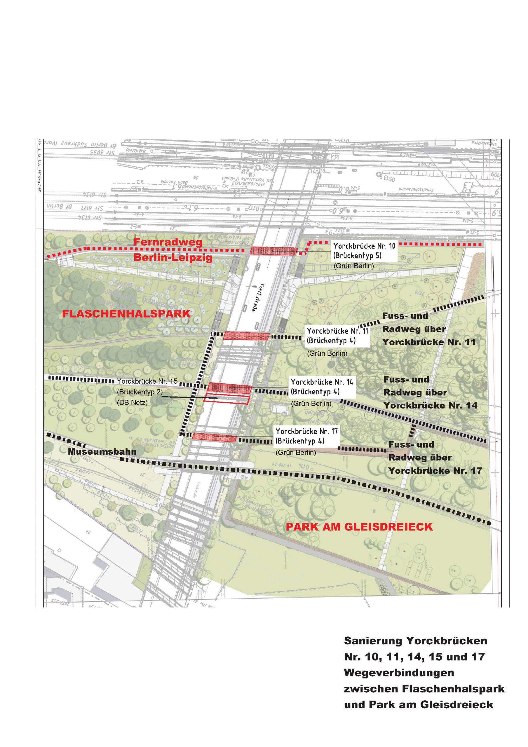 Am 20. Februar 2020, ab 7:00 Uhr, wird die Yorckbrücke 10 wieder in Betrieb genommen und steht dem Fuß- und Radverkehr zur Verfügung. Der Übergang über die zwischenzeitig hergerichtete Brücke 17 ist dann vorübergehend nicht möglich. Im Gegenzug wird dafür die Yorckbrücke 17 vorübergehend gesperrt und mit den endgültigen Wegebelägen versehen. Die Fertigstellung und Wiederfreigabe erfolgt voraussichtlich noch in diesem Frühling.